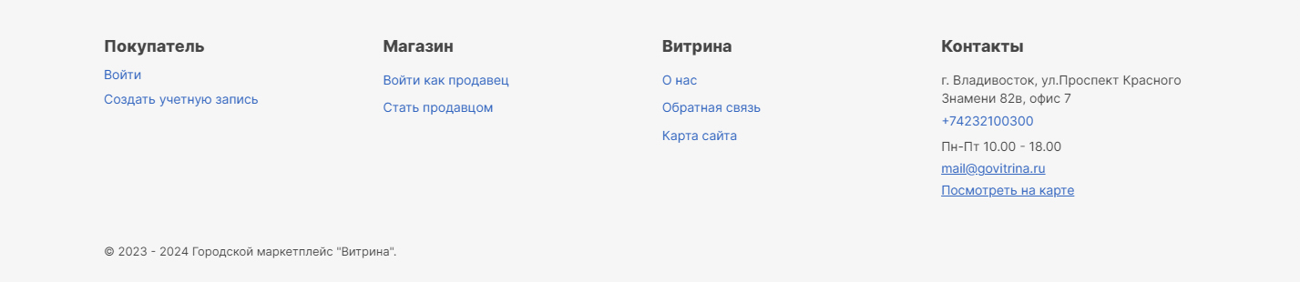 Самая нижняя часть сайта, где выводятся дополнительные сведения. В нашем магазине это ссылки на панель авторизации, меню и блок контактных данных